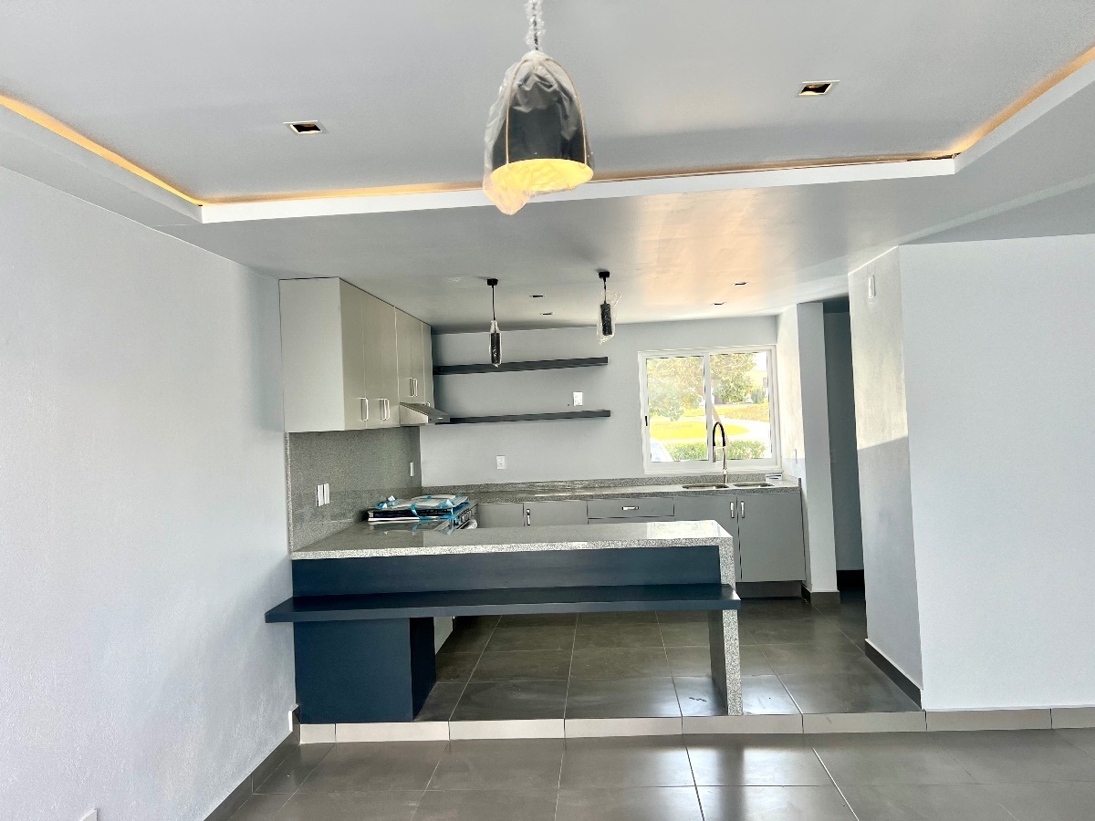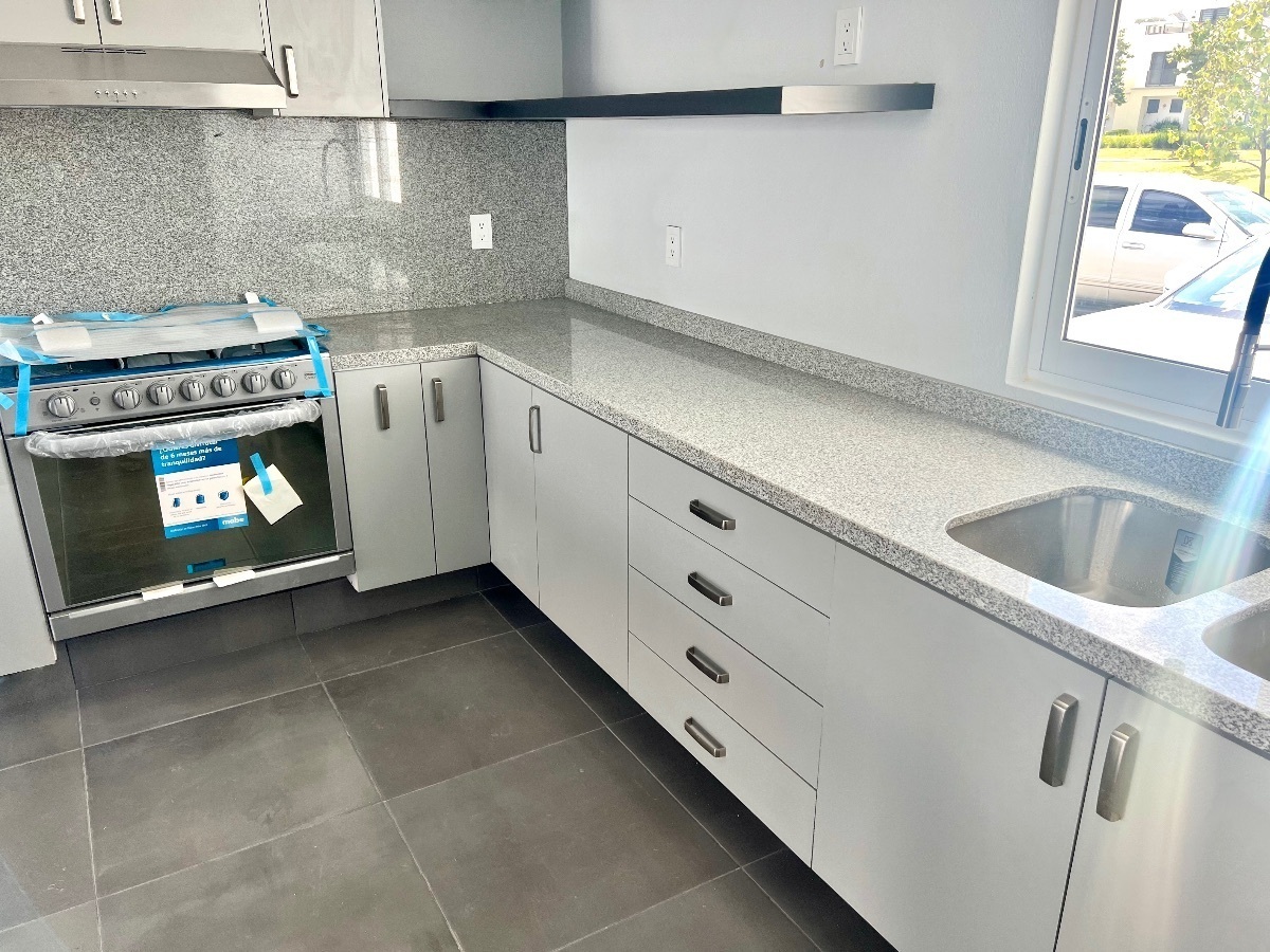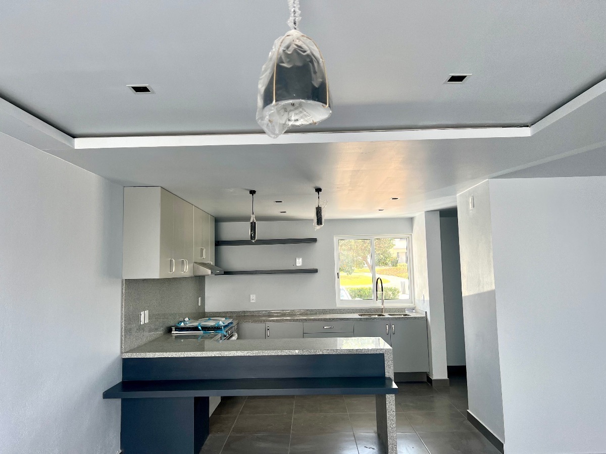 Cochera para dos autos, cocina súper equipada con estufa y campana.